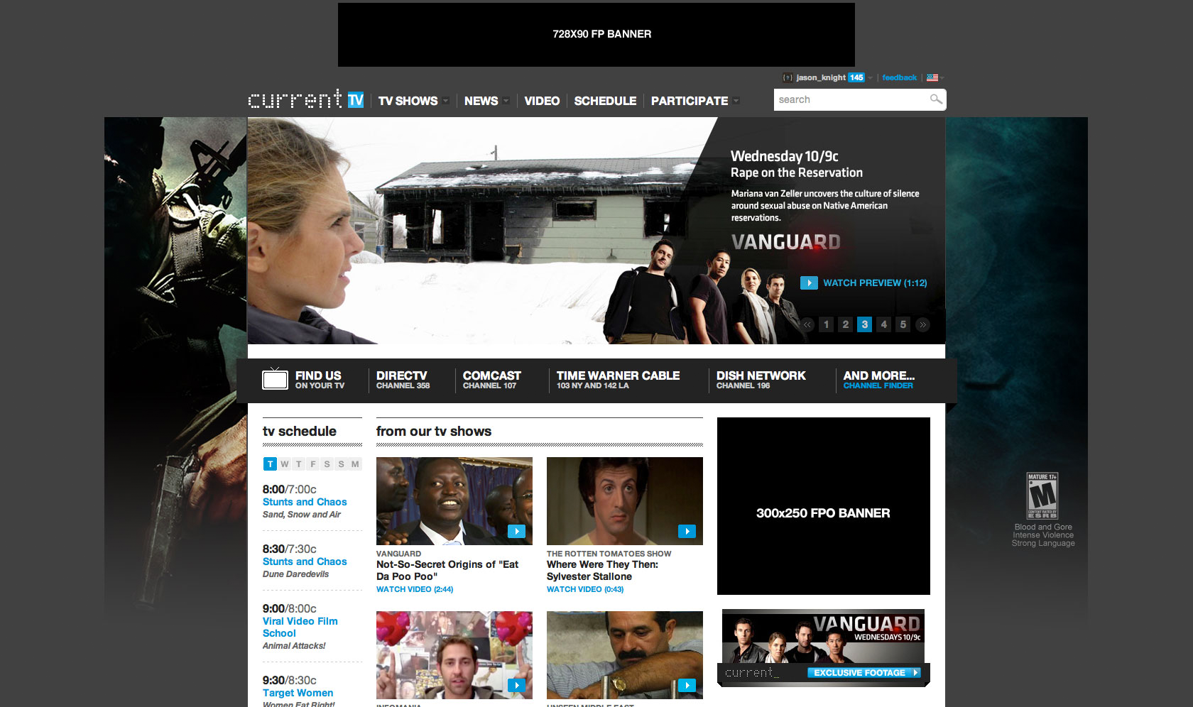 Visual designs and front-end development for Current TV interactive, including individual show pages, homepage takeover advertisements, and interactive components for the "choose your adventure" series Bar Karma.