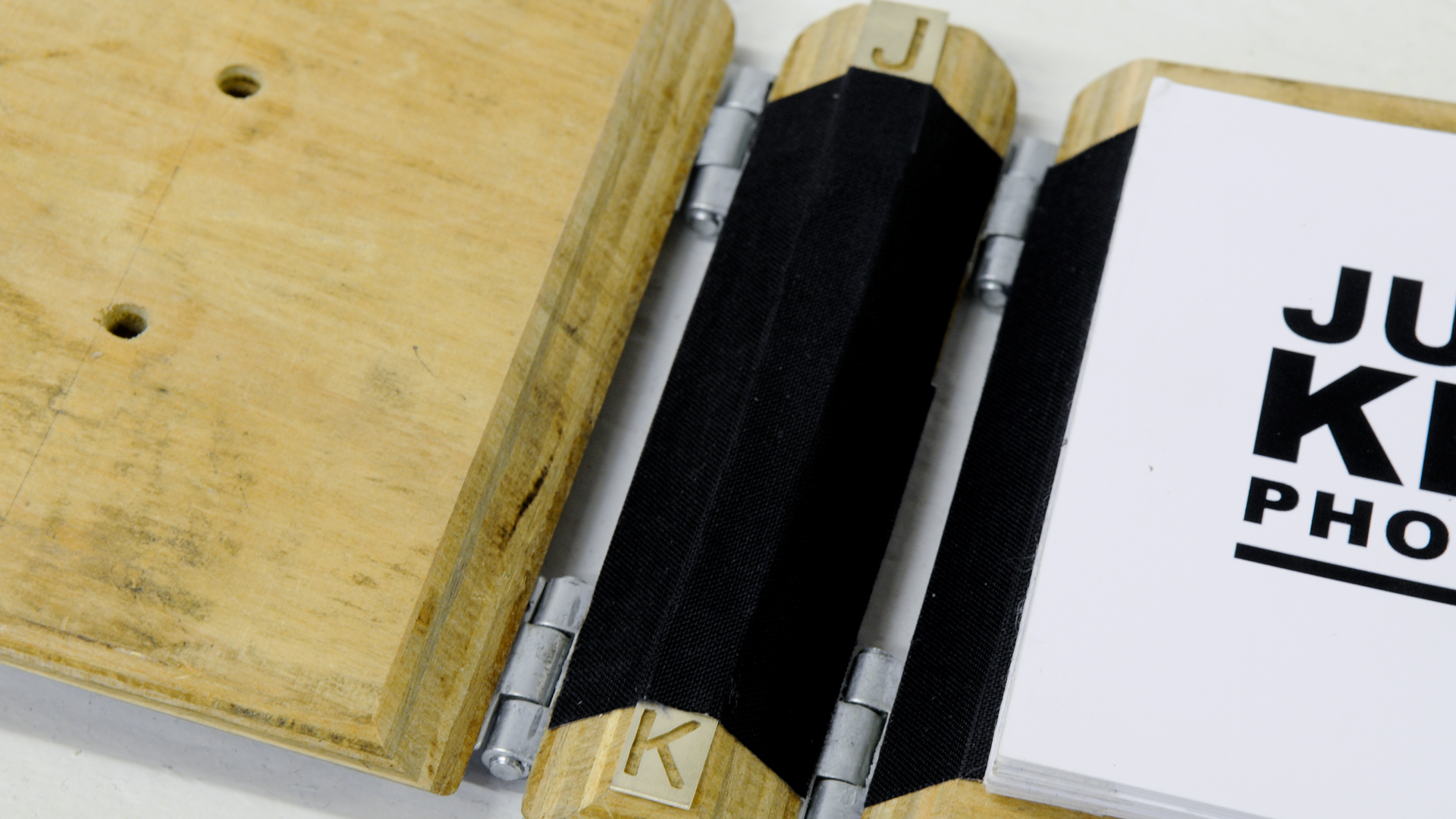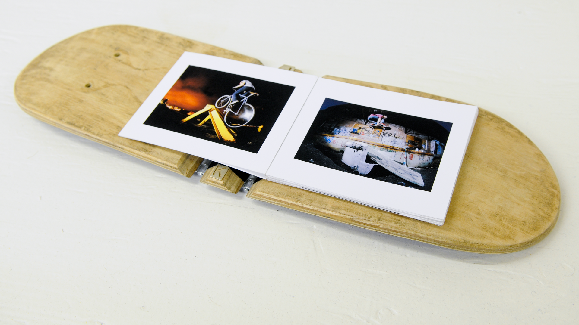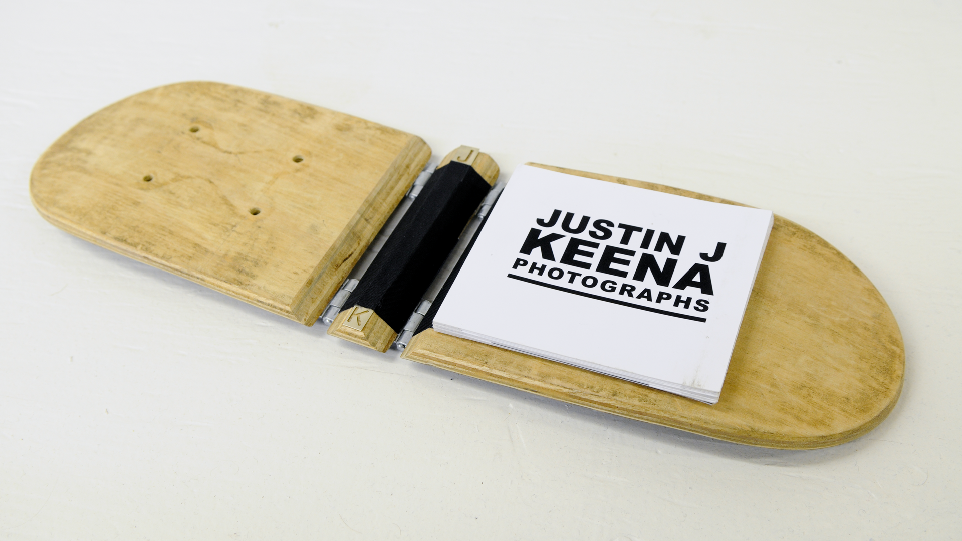 A custom portfolio book inspired by the subject of his photography, this portfolio book–fashioned out of an actual skateboard–sets the tone for Justin Keena's photos inside.